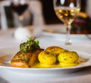 Our much-loved Sunday Lunch is a traditional selection of old favourites, including local sirloin of beef with Yorkshire pudding and all the trimmings.